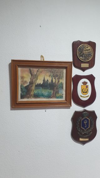 LOTE Bonito conjunto compuesto por un cuadro acuarela ARTESANIA con una bonita escena campestre.● Y tres placas O Metopas de madera con motivos diversos. - Perfecto para decoración. (Buen precio.) Por separado o el lote. ECONÓMICO.Las fotos salen sombras, son nuevas.