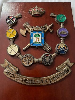 Metopa de la Primera Comandancia Móvil de la Guardia Civil. - Diseño con escudo central y símbolos representativos. - Corona real en la parte superior. - Inscripción PRIMERA COMANDANCIA MOVIL DE LA GUARDIA CIVIL en la base. Medidas: 25 largo, 19 ancho.