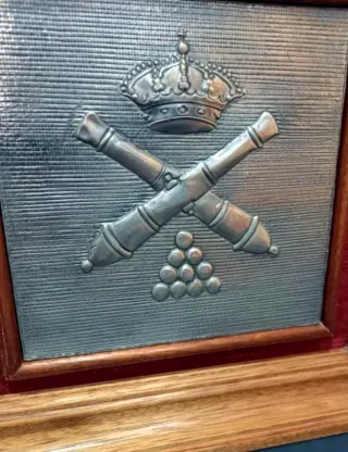 Cuadro Marco de Madera con Escudo de la Academia de Artillería en Estaño, Original Ejército Tierra Español. Medidas: 32,5 cm alto x 32,5 cm ancho x 3,5 cm fondo. En buen estado de conservación, con señales normales del uso y el tiempo. Consulta en mi perfil otros artículos de coleccionismo. Vintage retro auténtico cuerpo época década año cuartel mando soldado ideal repuesto calidad decorativo artesanal diseño colección coleccionista modelo pieza accesorio complemento clásico elegante escuela Corona Real Emblema Leyenda cañones cruzados balas inscripción lema Segovia plateado terciopelo rojo insignia enmarcado base repujado