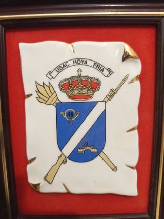 Metopa con el escudo de la USAC HOYA FRIA.. Tiene alguna rayadura en el marco.como se ve en las fotos. - Diseño con corona, escudos y fusiles cruzados. - Inscripción USAC. HOYA FRIA en la parte superior. - Fondo rojo y detalles dorados. Militar,ejército, medalla, rombos, cartuchera, granada, Legionario, legión, marina, Bripac,trinchas ,policía,guerra, Soldado, pistolera
