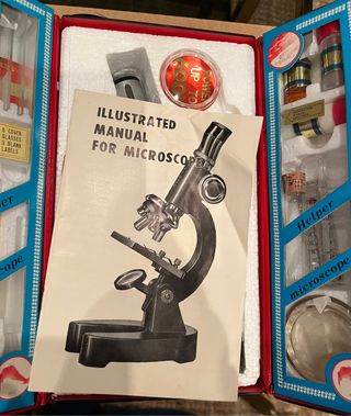 Microscopio antiguo de uso infantil. Con lentes de 60, 150, 200 y 400 aumentos. Con estuche para su transporte. El sistema de iluminación funciona con espejo. Divertido y entretenido para pequeños científicos. Bonito regalo para niños, coleccionistas, amantes de los objetos pop antiguos y frikis de lo vintage. Ideal para ayuda en las clases de biología. Barrio de Hortaleza. NO ME DESPLAZO.