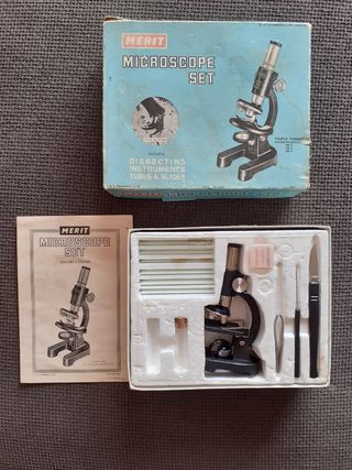 Microscopio Merit de los años 60 en su caja original. Está en buenas condiciones, aunque la caja muestra algo de desgaste por el paso del tiempo. Posibilidad de envío. - Incluye instrumentos de disección. - Tubos y portaobjetos. - Torreta triple con aumentos de 100x, 150x y 200x. Microscopio para estudiantes de Merit en caja, una herramienta educativa antigua diseñada para inspirar la curiosidad y la exploración. Fabricado por Merit, una conocida marca británica especializada en juguetes y kits educativos a mediados del siglo XX. -