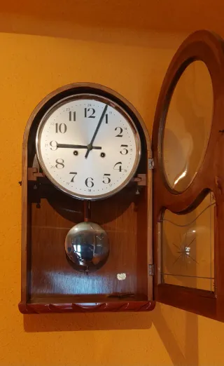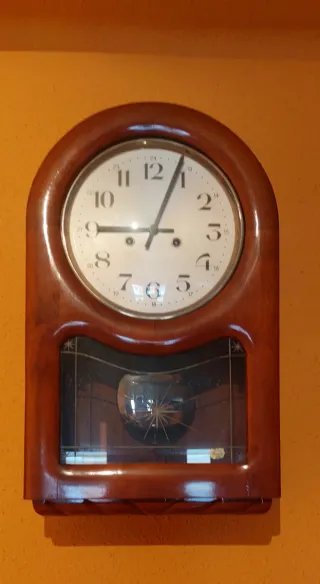 Elegante reloj de pared con caja de madera. - Diseño clásico con esfera redonda. - Detalles decorativos en cristal. Medidas: 55 cm de alto y 53 cm de ancho. Funciona, aunque lleva tiempo sin arrancarlo. Esta muy bien conservado.