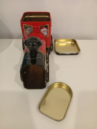 Original lata con forma de tren, ideal para coleccionar o guardar dulces en Navidad. Presenta un diseño festivo con Santa Claus y regalos. Lata metálica en forma de locomotora de tren, con diseño navideño de Papá Noel. Sirve para guardar galletas o bombones. Tiene dos tapas. Ideal como regalo, coleccionista o decoración. Nueva estilo vintage. Mide: 18 cm de largo y 10 cm de alto. - Forma de tren. - Decoración navideña. - Incluye a Santa Claus y regalos.