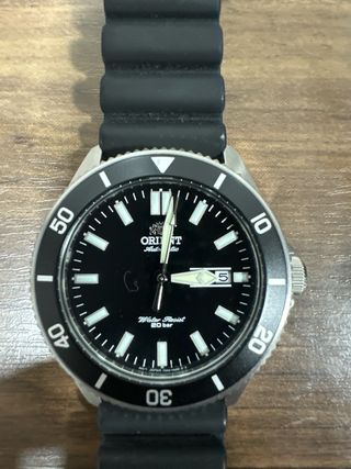 Reloj automático Orient Kano RA-AA0010B para hombre. Diseño deportivo y funcional. - Esfera negra. - Correa de caucho negra. - Bisel giratorio. • Movimiento: calibre Orient F6922 (automático, in-house) • Reserva de marcha: ~40 horas • Funciones: día + fecha • Diámetro: ~43–44 mm • Grosor: ~13 mm • Resistencia al agua: 200 m / 20 bar • Bisel: unidireccional de buceo • Cristal: mineral • Corona: roscada  Este calibre además tiene: • remonte manual • hacking (para el segundero al ajustar hora)  Estado IMPECABLE , sin uso