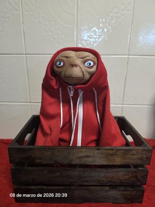 Figura del personaje ET, presentada dentro de una caja. Es todo nuevo, a la caja se le ha hecho un tratamiento de envejecimiento. - Figura de ET con sudadera roja. ET de 30 cm x 15 cm.