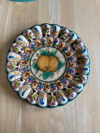 Precioso plato decorativo de cerámica, con un diseño unico de la fabrica taller marca Puente Arzobispo de Toledo. Ideal para añadir un toque artístico a tu hogar. - Motivo central de fruta membrillo tipico de la marca - Borde festoneado con motivos florales y geométricos. - Colores vibrantes y detallados pieza unica de coleccion artesania retro vintage clasico