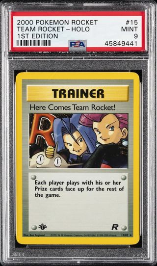 Carta de Pokémon de la expansión Team Rocket, edición 1st Edition. - Holo - Número #15 - Grado PSA 9 (Mint) - Incluye el arte de Here Comes Team Rocket! - Ilustración de Ken Sugimori