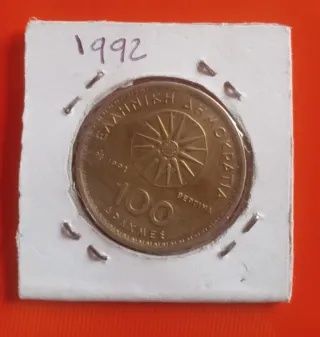 Moneda de 100 Dracmas de Grecia, año 1992. Presenta un diseño con el símbolo de Vergina. - Año: 1992 - Denominación: 100 Dracmas - País: Grecia - Símbolo: Vergina Sun