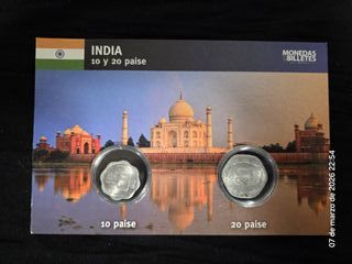 Conjunto de dos monedas de la India, 10 y 20 paise. Las monedas están presentadas sobre un fondo con una imagen del Taj Mahal. - Moneda de 10 paise. - Moneda de 20 paise con fecha de 1986.