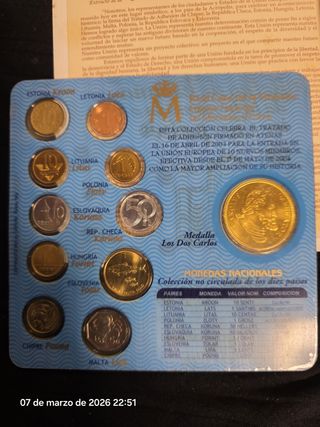 Colección de monedas de la Unión Europea, conmemorando la bienvenida de diez países. - Monedas de diferentes países europeos. - Incluye moneda de España. - Presentado en un mapa de Europa.