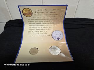 Conjunto de monedas conmemorativas de la peseta. - Moneda de 100 pesetas. - Moneda tradicional de 2.000 pesetas de plata. - Reverso conmemorativo con la figura de Hispania. - Emisión de 1869.