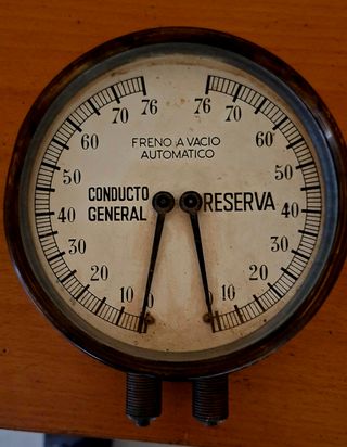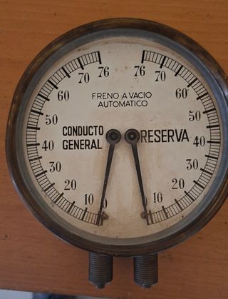 Manómetro para sistema de freno a vacío automático. -locomotora antigua - Indicador de presión para Conducto General. - Indicador de presión para Reserva. - Escala en unidades de presión. -le falta la tapa de cristal tal y como se aprecia en las foto -mide 20cm por 15cm -650 gramos