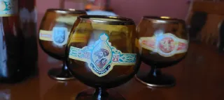 Conjunto de botella de licor y seis copas de coñac con un diseño vintage. - Botella de vidrio ámbar con tapón de madera. - Seis copas de vidrio ámbar con detalles dorados. - Cada copa tiene una etiqueta decorativa.