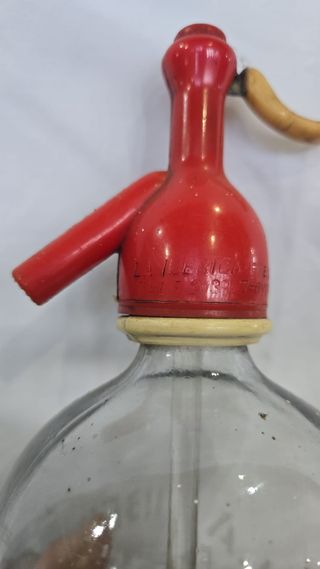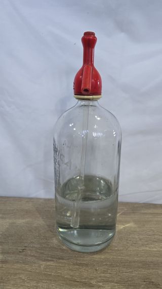 Sifón de vidrio con un diseño clásico y un dispensador en color rojo. - Botella de vidrio transparente. - Dispensador de plástico rojo. - Tubo interior para la dispensación. - Estado: Buen estado - Se entrega tal y como se ve en las fotos Se puede ver y probar en Moreda (Asturias) o envios mediante Wallapop. Precio no negociable. Envio en maximo 2-3 dias. Tlf 622695177. Precio 15€