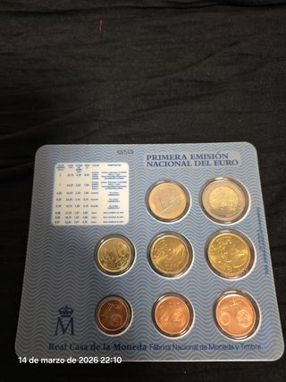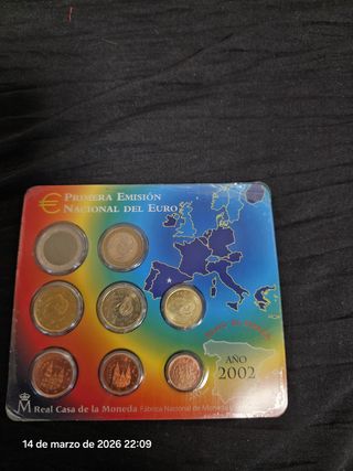 Conjunto de monedas de la Primera Emisión Nacional del Euro de España, año 2002. - Incluye varias denominaciones de euros. - Diseño conmemorativo del Reino de España. - Emitidas por la Fábrica Nacional de Moneda.
