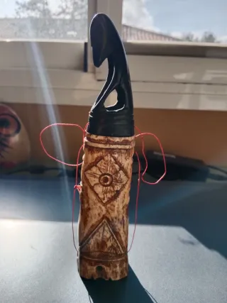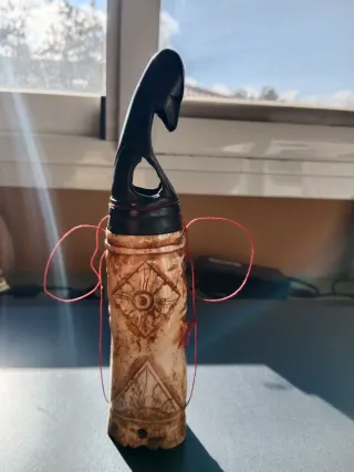 Este recipiente artesanal está bellamente tallado con intrincados diseños, el tapón con forma de mono en madera de ébano. - Material: Hueso y madera tallada. - Decoración: Motivos geométricos y un círculo central. - Adorno: Hilo rojo unido al tapón.