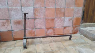 Antiguo morrillo de hierro forjado, ideal para chimenea. Está en buenas condiciones, está en hierro natural con oxido como se aprecia en las fotos , mide de largo 77 cm y de alto 50 cm , es grande. - Diseño rústico y robusto. - Soporte con gancho.