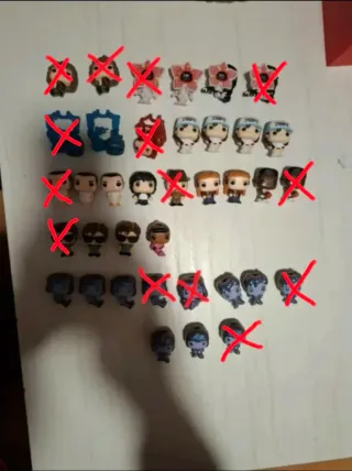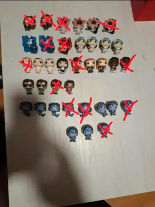 Colección de figuras Funko Pop! de Stranger Things, provenientes de huevos Kinder. Venta mínima en envío 4 funcos. Los tachados están vendidos. - Figuras de personajes de la serie. - Diseños variados.