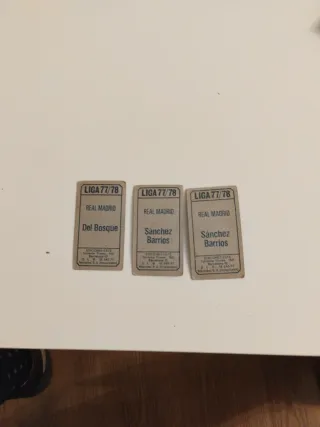 Lote de tres cromos de la colección de la temporada 77/78 del Real Madrid. - Cromo de Del Bosque. - Dos cromos de Sánchez Barrios. - Editados por Ediciones Este.
