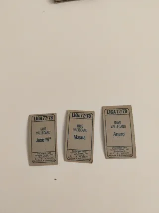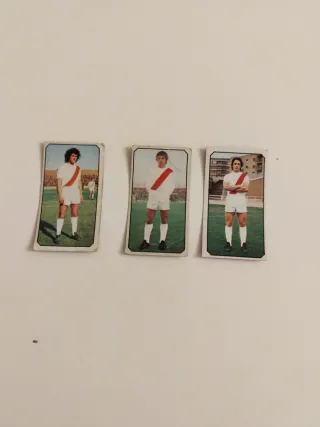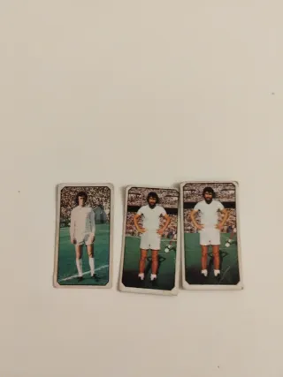 Lote de cromos de la colección de la temporada 1977-1978. - Tres cromos de futbolistas. - Cada cromo muestra un jugador con uniforme de fútbol.