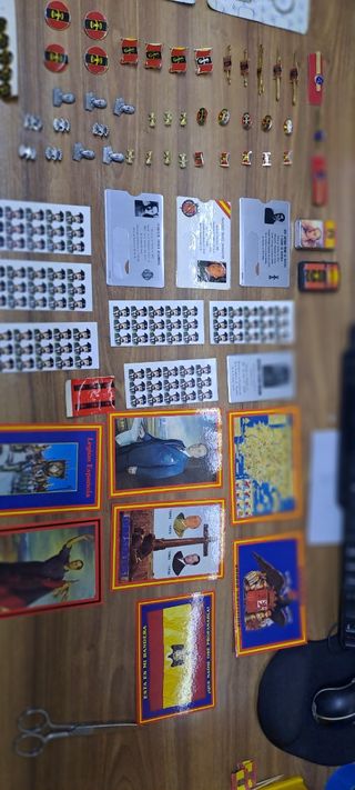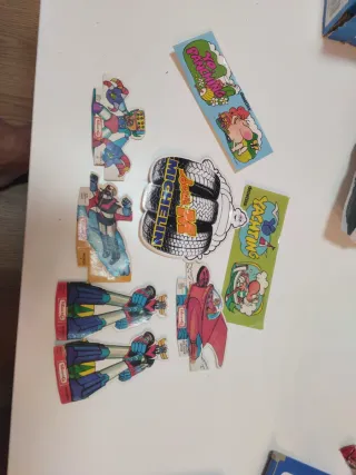 Lote de cromos y pegatinas coleccionables. - Incluye pegatinas de robots y personajes. - Diseño retro y colorido.