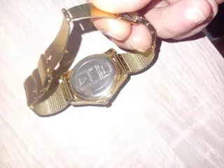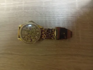 Elegante reloj con detalles brillantes y un llamativo estampado. - Esfera con diseño de leopardo. - Bisel adornado con pedrería. - Correa de malla dorada. - Cierre de seguridad.