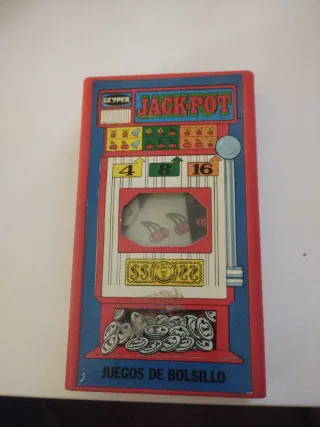 Juego de bolsillo tipo tragaperras de la marca Geyper. - Diseño inspirado en una máquina Jack-Pot. - Incluye imágenes de frutas y números. - Representación de monedas en la parte inferior.