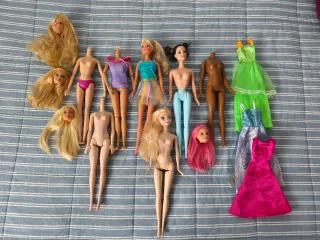 Lote de muñecas Barbie y accesorios. - Varias cabezas de Barbie. - Cuerpos de Barbie sin cabeza. - Vestidos de diferentes colores y estilos.