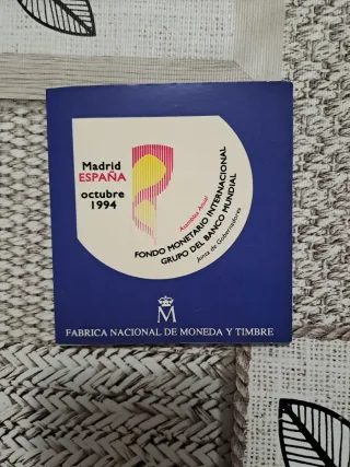 Cartera conmemorativa de la Asamblea Anual del Fondo Monetario Internacional y el Grupo del Banco Mundial celebrada en Madrid en octubre de 1994. - Diseño de la Fábrica Nacional de Moneda y Timbre. - Incluye Asamblea Anual FMI y Junta de Gobernadores. - Calidas Proof. - Peso moneda 18.2 gr - Plata de ley 925 milesimas - Tirada 30.000 unidades. Precio por debajo del intrinseco de la plata!!! Aproveche la ocasion!!!