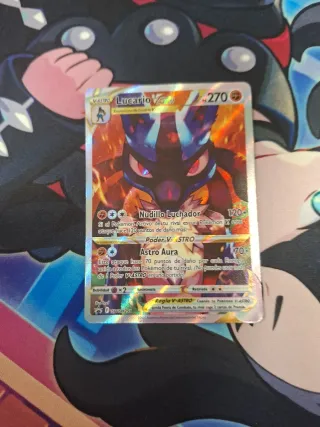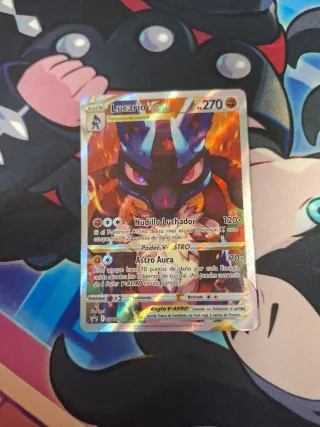 Carta Pokémon Lucario VSTAR de la expansión Promo. - Ataque Nudillo Luchador: 120+ puntos de daño. - Poder VSTAR Astro Aura: 70x puntos de daño. - Regla VSTAR: Al usar este poder, el rival coge 1 carta de Premio.