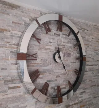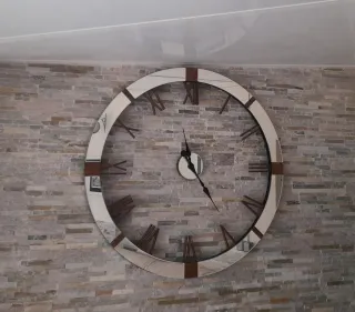 Elegante reloj de pared con un diseño moderno y números romanos. - Marco exterior cristal. - Detalles en madera oscura. - Diseño de gran tamaño. - Medidas 1.20 m