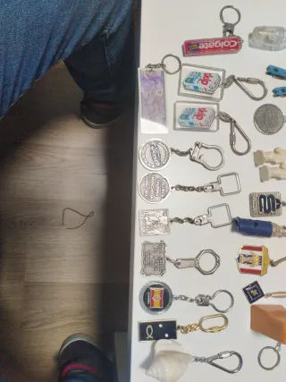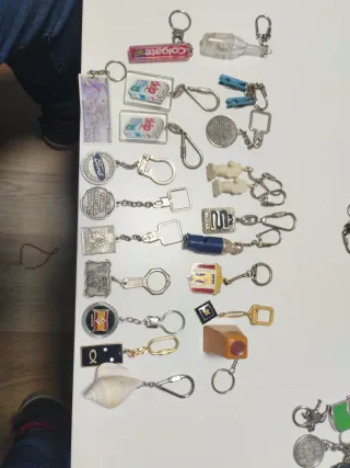 Lote de llaveros variados con diferentes diseños y temáticas. - Llavero con billete de 100. - Llavero con logo de Ford. - Llavero con forma de concha. - Llavero con forma de pez. - Llavero con forma de botella. - Llavero con forma de pinza de la ropa. - Llavero con forma de silbato. - Llavero con forma de figura humana. - Llavero con forma de coche. - Llavero con forma de caja. - Llavero con forma de bandera. - Llavero con forma de moneda. - Llavero con forma de pastilla de jabón. - Llavero con forma de paquete de detergente.