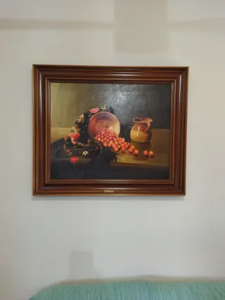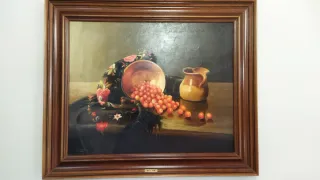 Pintura al óleo de Pedro J. Ibañez. - Bodegón con jarra y frutas. - Marco de madera.