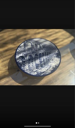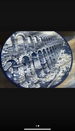 Plato de cerámica con un diseño detallado de un acueducto. - Diseño en azul y blanco. - Motivo arquitectónico. - Borde decorativo.