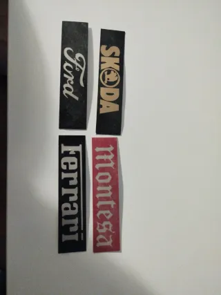 Conjunto de cuatro pegatinas coleccionables de marcas automovilísticas y de motocicletas. - Pegatina Ford. - Pegatina Skoda. - Pegatina Ferrari. - Pegatina Montesa.