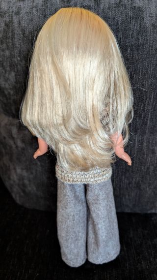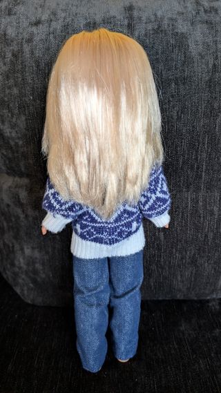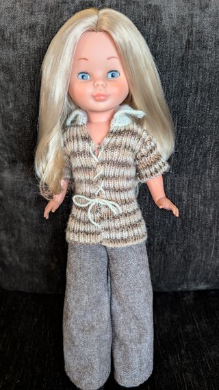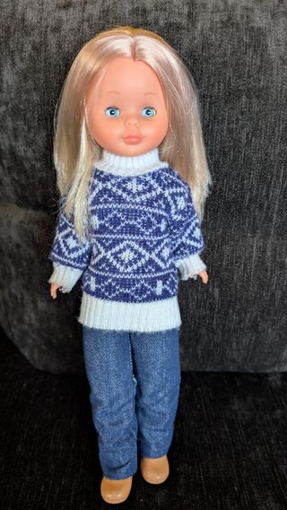 Muñeca Nancy rubia de los años 70. Conserva su ropa original. - Pelo rubio. - Ojos azules. - Vestido de punto azul y blanco. - Pantalones vaqueros.