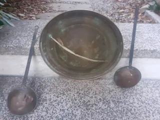 Conjunto de brasero antiguo de latón con dos cucharones. - Brasero de latón con asas decorativas. - Dos cucharones con mangos largos de metal. No esperes a que se te adelanten