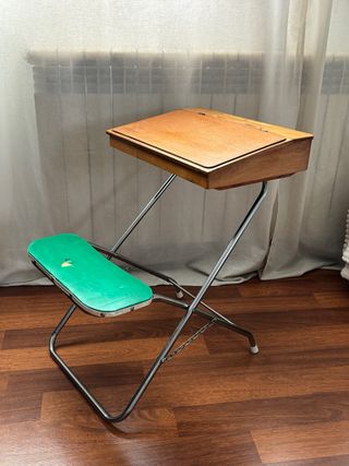 Pupitre escolar vintage con estructura de tijera. Combina una superficie de madera para escribir y asiento. - Estructura metálica. - Superficie de madera.