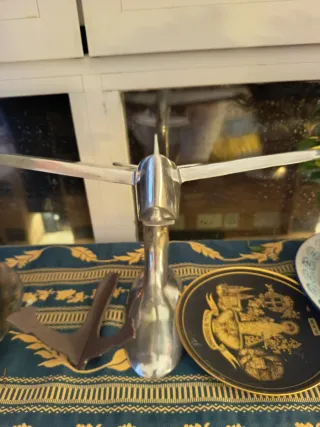 Preciosa escultura de hierro con un diseño inspirado en un avión. Una pieza de arte única para decorar cualquier espacio. - Material: Hierro. - Diseño: Estilo avión.