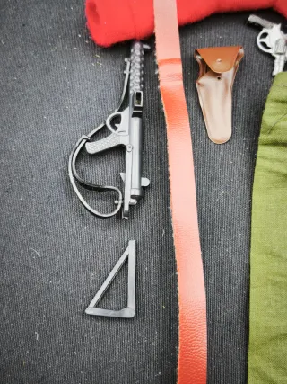 Equipación de geyperman Jersey rojo Pantalón Botas marrones Cinturón Funda y revolver Sterling