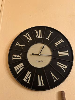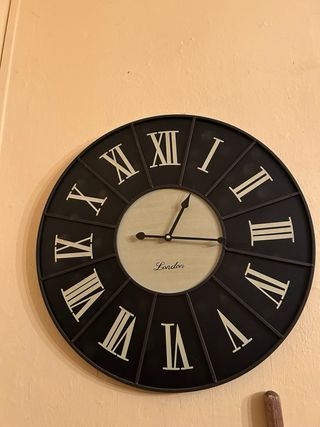 Reloj de pared de diseño vintage y números romanos. - Marco exterior negro. - Esfera clara con el nombre London en el centro. - Agujas finas y discretas. - Funciona con pilas.