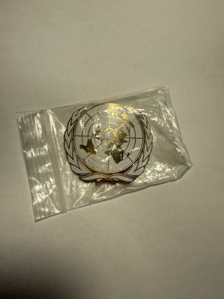 Distintivo metálico con el emblema de la ONU, ideal para boinas o uniformes. - Es original. - Diseño circular con el mapa del mundo. - Rodeado por dos ramas de olivo. - Acabado en blanco y dorado.