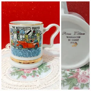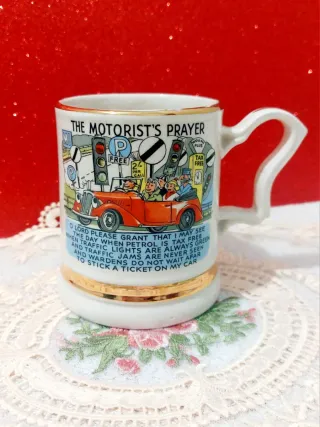 Taza de cerámica vintage con un diseño humorístico y un mensaje para conductores. - Ilustración The Motorist's Prayer con un coche y señales de tráfico. - Texto del Motorist's Prayer impreso en la taza. - Borde y base dorados. - Inscripción Prince William Warranted 22 Carat Gold en la base. Preciosa taza, jarra Inglesa Súper vintage 1950s 'La oración del automovilista' Borde y ribetes de oro 22kt Prince William Potteries 10cm alto, 8cm diámetro Coleccionismo 🍀✨️🍀✨️🍀 #englishcup #tazainglesavintage #cleccionismo #coupedangleterre #coppadinghilterra #taçainglesa #vintagelovers