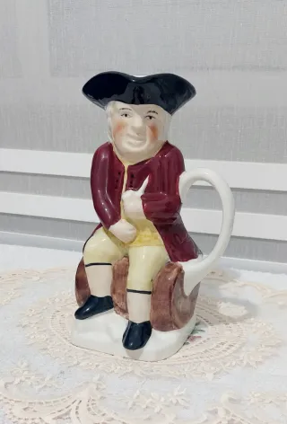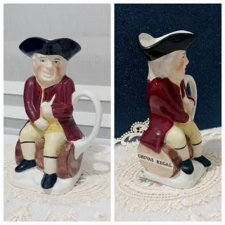 Jarra de cerámica con diseño de figura sentada, inspirada en la marca Chivas Regal. - Figura de hombre con sombrero de época. - Detalle de chaqueta y pantalón. - Asa curva. - Base con inscripción