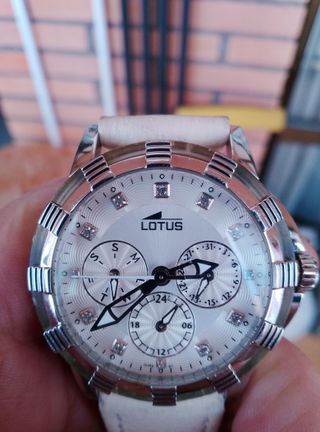 Reloj de pulsera de la marca Lotus con esfera blanca y detalles. - Indicadores de hora, dia de la semana. dia del mes, 24 horas - Correa de color blanco. -Caja de 40 mm sin contar la corona -En muy buen estado, Funcionando.