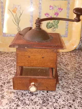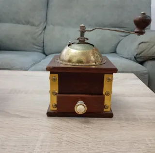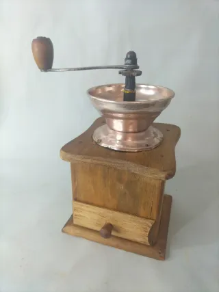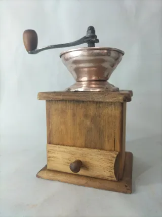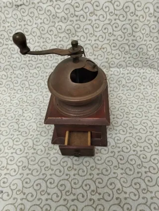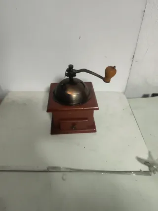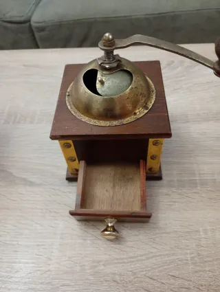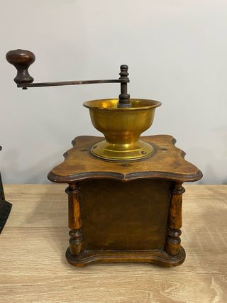 Molinillo de café antiguo con cuerpo de madera y detalles metálicos. - Mecanismo de molienda manual. - Cajón extraíble para el café molido. - Diseño clásico y decorativo.
