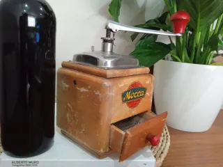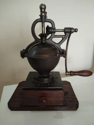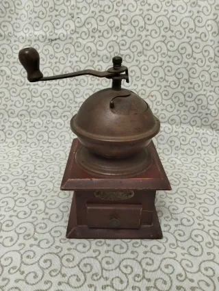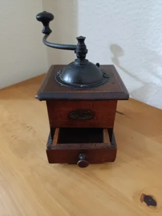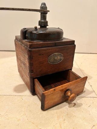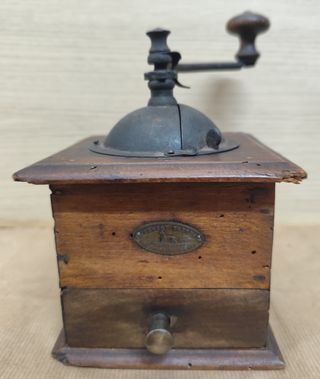 Este es un molinillo de café antiguo con una base de madera y detalles metálicos. - Base de madera. - Mecanismo de molienda metálico. - Cajón extraíble para el café molido. - Etiqueta decorativa en la parte frontal.