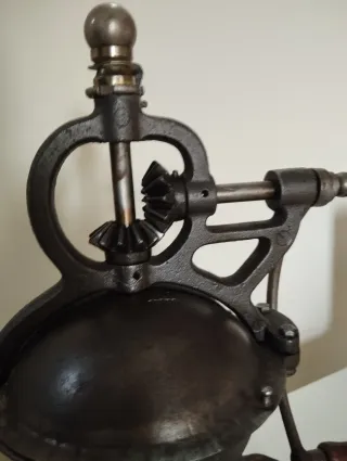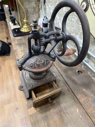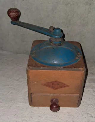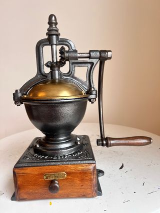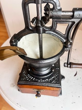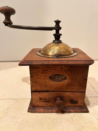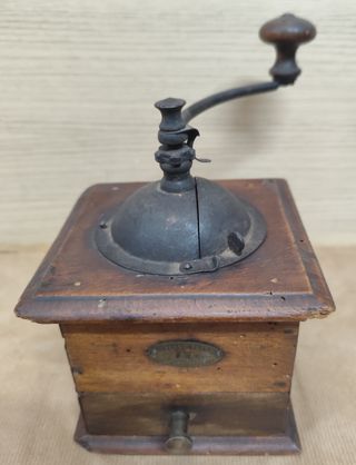 Molinillo de café antiguo de la marca Japy. - Cuerpo principal de hierro fundido. - Tapa superior de latón. - Cajón de madera para el café molido. - Mecanismo de molienda con manivela.