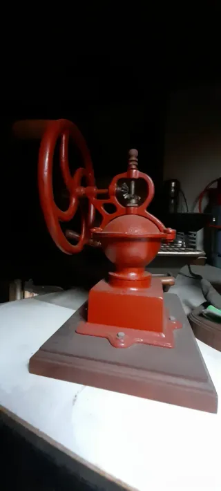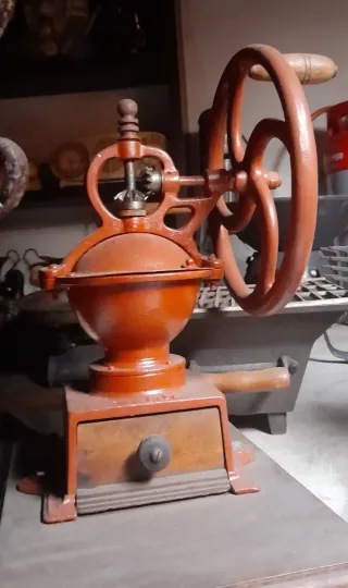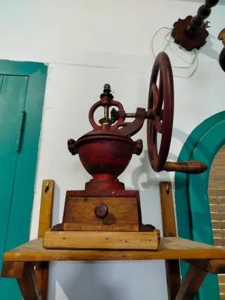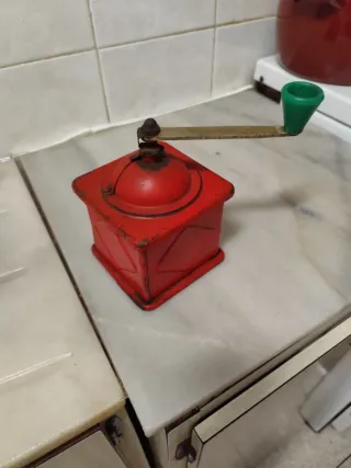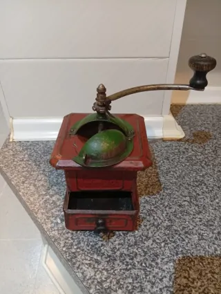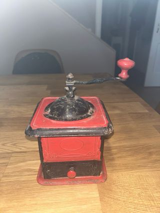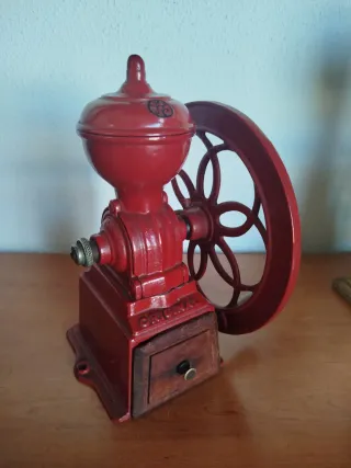 Molinillo de café antiguo de estilo francés, con un diseño clásico y robusto. - Cuerpo principal de metal esmaltado en color rojo. - Volante de gran tamaño para facilitar la molienda. - Cajón de madera para recoger el café molido. - Mecanismo de molienda visible en la parte superior.